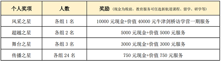 全国阶段/中外青少年展演奖项:所有参与的选手将被授予“中国故事精彩讲述者”称号,并用个人奖项做差异区分排名第1、排名第2~3、排名第4~6以及排名第7~30名的选手。