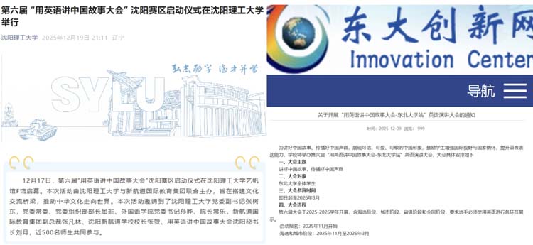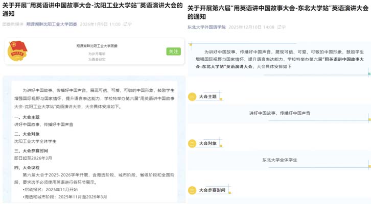 第六届“用英语讲中国故事大会”沈阳选区的筹备工作,让高校力量成为沈阳焕发新生的强劲动能,让盛京故事在青春演绎中愈发鲜活动人。截至目前,辽宁大学,沈阳大学,沈阳理工大学,东北大学,沈阳建筑大学,沈阳师范大学,沈阳化工大学,沈阳城市学院等高校已相继参与到活动中来,其中多所高校已发布了活动通知。